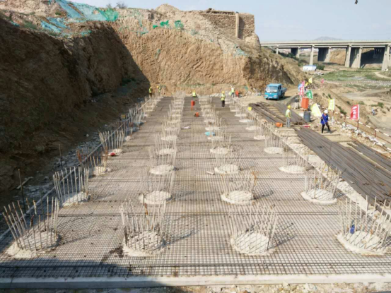 項目施工者秉承“聚焦中冶主業,建設美好中冶”發展愿景根據工程特點,優化施工工藝。以“安全責任,重于泰山”為己任,克服施工作業面小,地層堅硬等原因,在樁基部分采用人工挖孔施工,沖擊鉆施工和旋挖鉆多種方式配合施工大幅度提高了施工效率,降低了施工成本,加快了施工進度。樁基鋼筋籠施工時,采用汽車吊大小鉤配合動滑輪作業,克服了整節鋼筋籠重、長的施工難點,改進鋼筋籠分節安裝施工工藝,采用無分節施工工藝,全部采用平焊,無對接段的立焊,提高了焊縫的質量,節約了時間,提高生產效率,加快施工進度。在承臺、拱座及立墻結構大體積混凝土施工時,分別采用外敷草簾灑水,內通冷卻水管降溫的施工工藝,保證混凝土澆筑后的養護條件。項目全體參戰職工發揚“一天也不耽誤,一天也不懈怠”樸實厚重的中冶精神,群策群力,積極參與施工方案與施工工藝的設計與編制工作,集思廣益,針對各工序的施工難點編制專項施工方案,攻克技術難關,各項施工方案逐個完善。樁基工程按照施工方案,精準放樣——鉆孔——清孔——鋼筋籠安裝——水下混凝土澆筑連續施工。樁基施工完畢后,進行土方開挖,樁頭混凝土鑿除,樁基完整性檢測,地基驗槽,墊層澆筑、承臺及拱座結構施工。各工序緊密銜接,五個承臺流水作業,實現高效生產,保證施工工期。