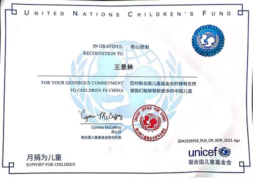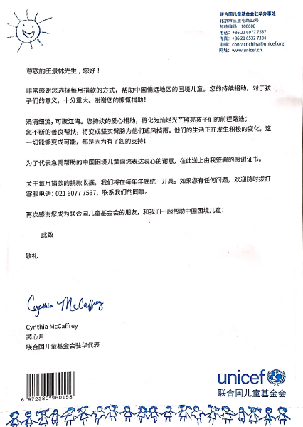6月9日,聯合國兒童基金會致謝中國二冶優秀青年員工王景林,對其多年來堅持向聯合國兒童基金會捐款表示衷心感謝。