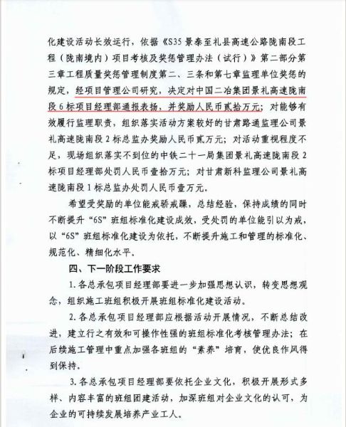 6月15日,景禮項目部在項目管理公司組織的6S班組標(biāo)準(zhǔn)化建設(shè)檢查中名列前茅,為此,項目管理公司對景禮六標(biāo)項目部進行通報表揚,并給予獎勵20萬元。