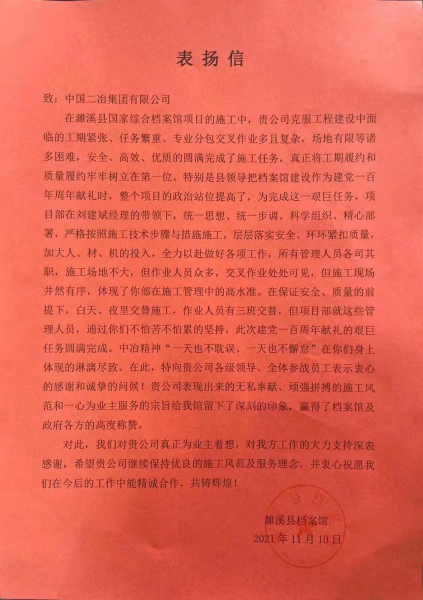 11月10日,濉溪縣檔案館致中國二冶表揚(yáng)信,對中國二在濉溪國家檔案館EPC總承包項(xiàng)目建設(shè)中,克服工程建設(shè)工期緊張、任務(wù)繁重、專業(yè)交叉作業(yè)多、場地有限等諸多困難,安全、優(yōu)質(zhì)、高效地圓滿完成施工任務(wù)給予表揚(yáng)。