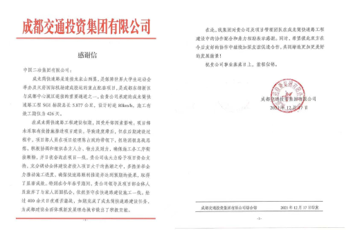 12月17日,成都交通投資集團有限公司致中國二冶表揚信,對中國二冶四川分公司在成龍簡快速路工程項目施工建設(shè)中,攻堅克難、頑強奮戰(zhàn),優(yōu)質(zhì)、安全、高效地完成施工建設(shè)任務(wù),順利實現(xiàn)快速路主體工程全線貫通給予表揚。