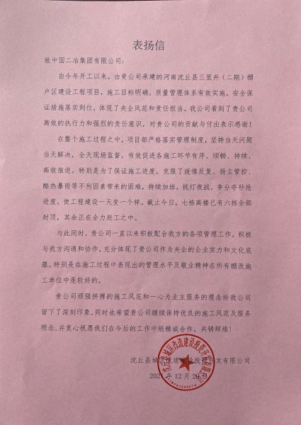 12月29日,沈丘縣城區(qū)改造建設(shè)投資開發(fā)有限公司向中國二冶發(fā)來表揚信,對中國二冶各級領(lǐng)導(dǎo)給予工程高度重視和大力支持表示衷心感謝,對該項目自開工建設(shè)以來,項目部全體人員所付出的努力和艱辛給予肯定和表揚。