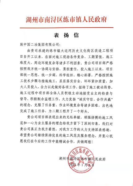 1月4日,湖州市南潯區練市鎮人民政府致中國二冶表揚信,對中國二冶路橋分公司大運河項目部無私奉獻、頑強拼搏的施工風范和一心為業主服務的理念表示感謝。