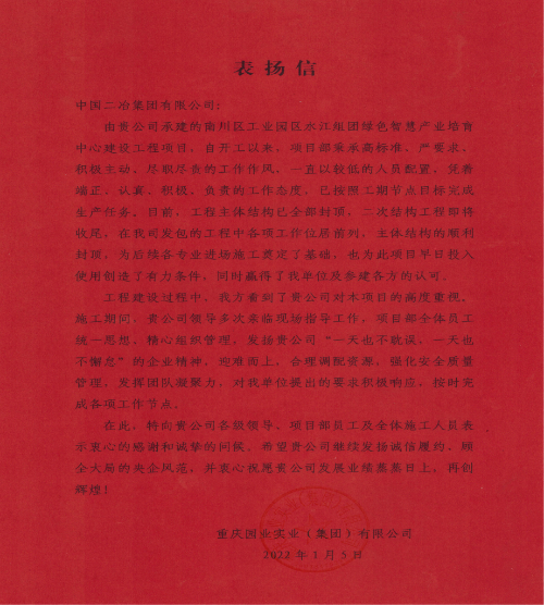 重慶園業實業(集團)有限公司在表揚信中指出,中國二冶南川區工業園區水江組團綠色智慧產業培育中心建設工程項目自開工以來,項目經理部秉承高標準、嚴要求、積極主動、盡職盡責的工作作風,如期完成建設方下達的工程進度目標,在其公司發包的眾多工程中各項工作位居前列。希望項目部能夠在接下來的施工建設工作中繼續協調各方、持續發力,推進項目早日建成并投入使用,同時祝愿中國二冶集團有限公司發展業績蒸蒸日上,再創輝煌。