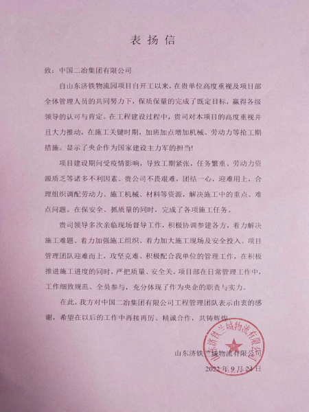 9月29日,山東濟(jì)鐵蘭城物流有限公司向中國(guó)二冶致表揚(yáng)信,表揚(yáng)中國(guó)二冶團(tuán)結(jié)一心、迎難而上,在施工關(guān)鍵節(jié)點(diǎn),加班加點(diǎn)搶工期,克服重重困難,保質(zhì)保量完成既定目標(biāo),充分展示出央企作為國(guó)家建設(shè)主力軍的擔(dān)當(dāng)作為。