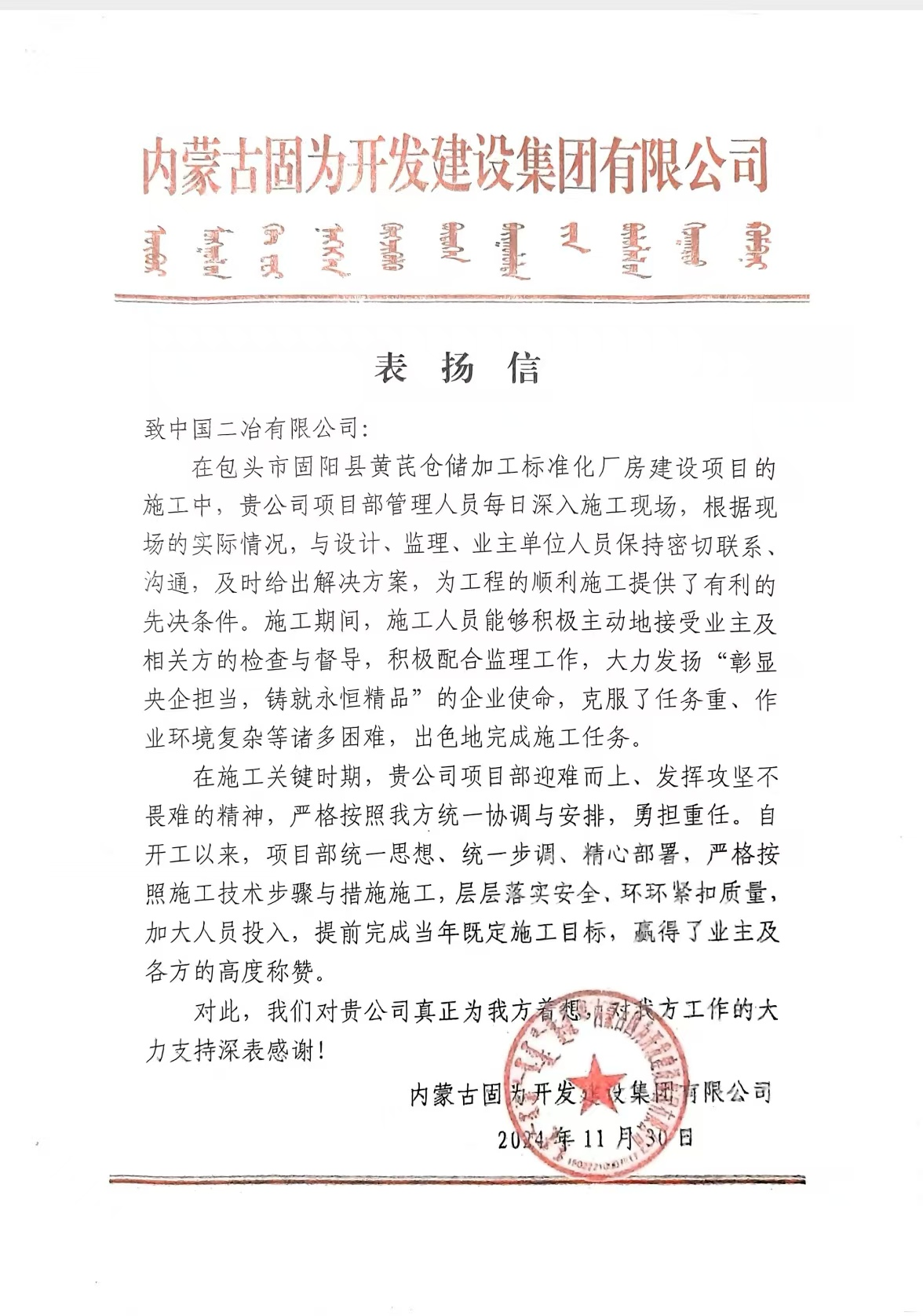 12月2日,中國(guó)二冶收到內(nèi)蒙古固為開(kāi)發(fā)建設(shè)集團(tuán)有限公司發(fā)來(lái)的第二封表?yè)P(yáng)信,高度稱(chēng)贊項(xiàng)目管理團(tuán)隊(duì)提前完成固陽(yáng)縣黃芪倉(cāng)儲(chǔ)加工標(biāo)準(zhǔn)化廠房建設(shè)項(xiàng)目既定目標(biāo)的杰出表現(xiàn)。