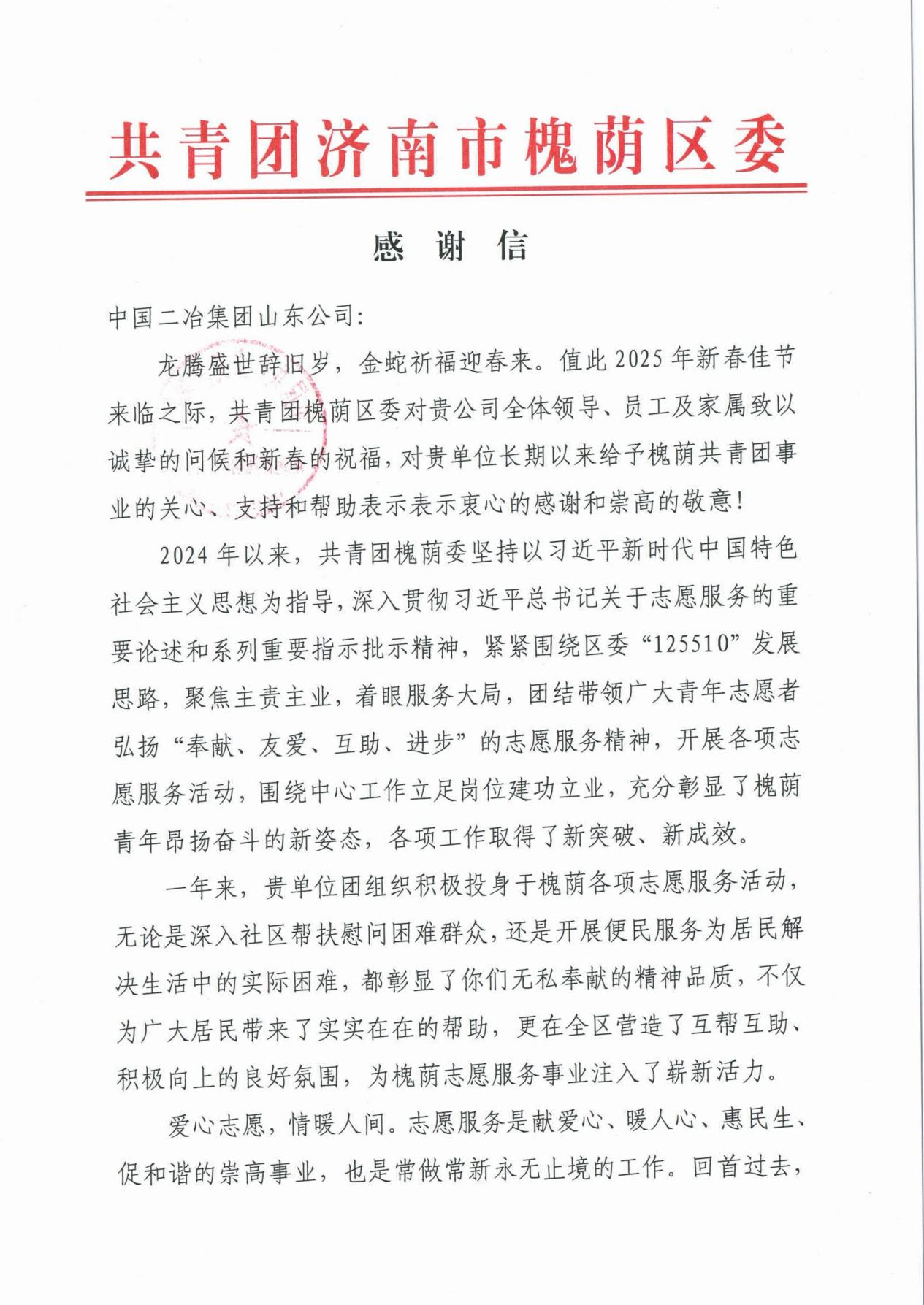 此次收到感謝信,不僅是對山東公司團(tuán)委工作成果的肯定,更是對后續(xù)積極參與駐地共青團(tuán)各項(xiàng)工作的激勵。下一步,山東公司將結(jié)合生產(chǎn)經(jīng)營實(shí)際,加強(qiáng)與駐地的深度融合,團(tuán)結(jié)分公司廣大青年員工為公司高質(zhì)量發(fā)展和駐地社會經(jīng)濟(jì)發(fā)展貢獻(xiàn)青春力量。